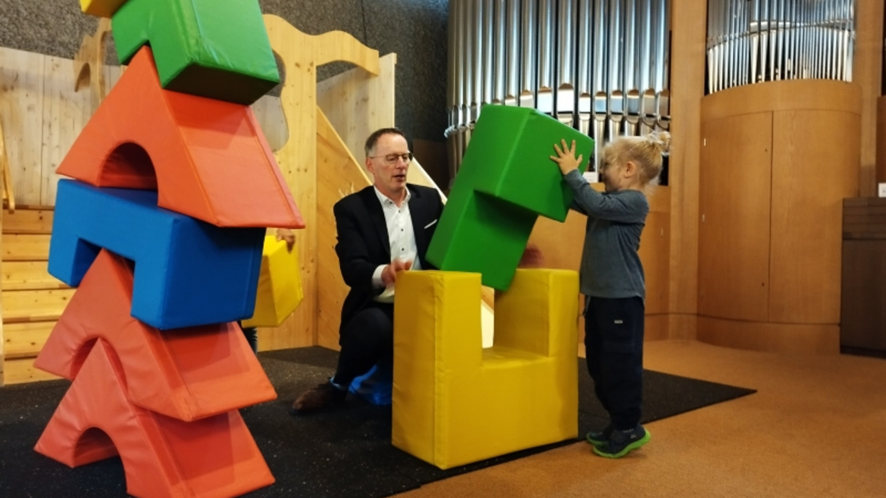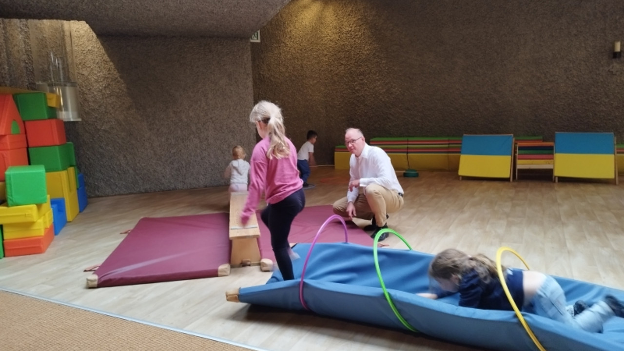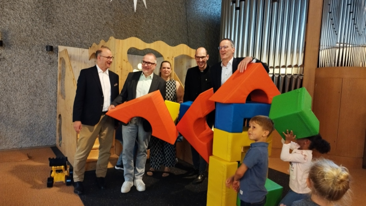 Innenminister Michael Ebling hat zum alljährlichen Ausblick auf den Tag des offenen Denkmals in die Kita St. Paulus in Ingelheim eingeladen. Diese befindet sich in einer ehemaligen Kirche, in deren Gebäude nun die Kinder spielen und lernen.